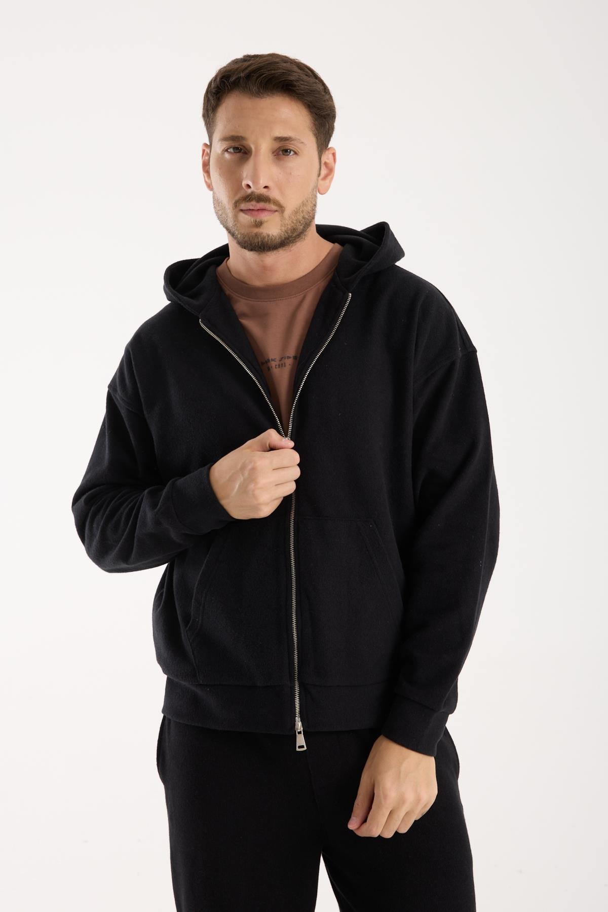 Erkek Oversize Selanik Kumaşı Kapüşonlu Fermuarlı Sweatshirt (50100-03)